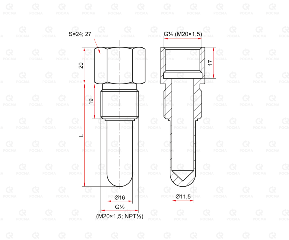 Пример обозначения: Гильза для термометра ××.220 L=150 мм, d=16, G½-G½ (внутр.-наруж.), 60 МПа, нерж.