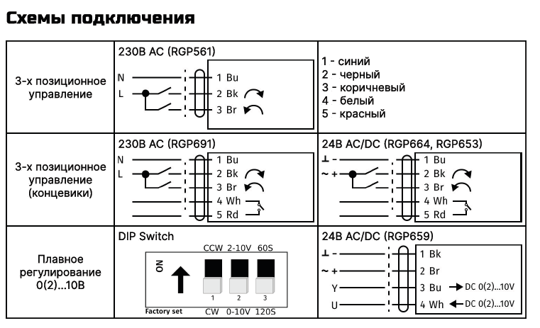 Для подключения привода с 3-х точечным управлением подключите управляющие сигналы согласно схеме. Вращение привода достигается путем подачи напряжения 24 или 220В на один из проводов (черный или коричневый), синий провод «нейтраль» от сети или трансформатора 24В АС. По белому и красному проводам посылается обратная связь с концевого выключателя, встроенного в привод (при наличии).