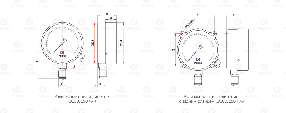 | Тип | Диаметр корпуса | Класс точности | Диапазон показаний, МПа | Резьба присоединения | Присоединение (расположение штуцера) |