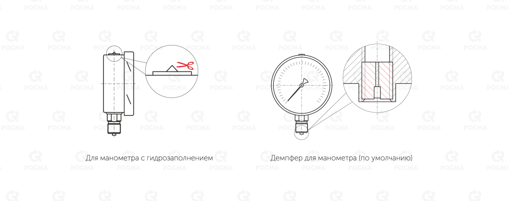 Для манометров с возможностью гидрозаполнения после монтажа необходимо срезать специальный выступ на пробке прибора или проколоть отверстие в пробке.