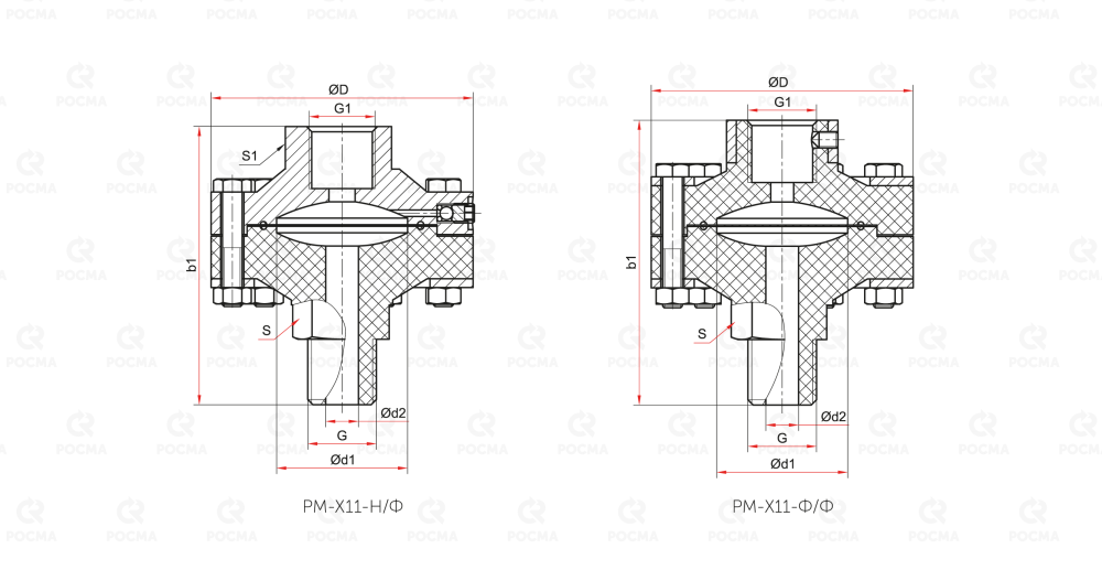 | РМ-Х11-Н/Ф | Ø80 | штуцерное | внутренняя М20×1,5 (G½) — наружная М20×1,5 (G½) | 14210 |