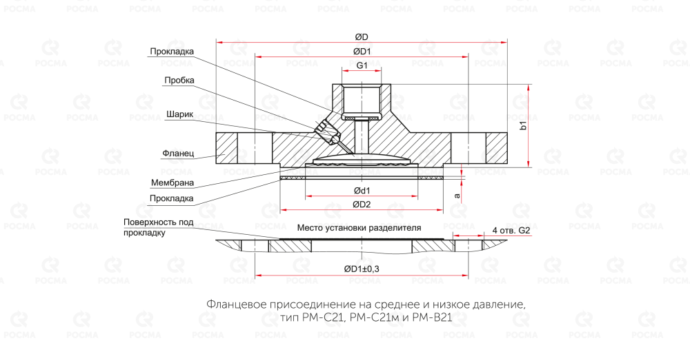 Для облегчения монтажа фланцевых разделителей РМ-С21 и РМ-С21м применяются ответные части (чертежи), которые привариваются к месту отбора давления, а уже на фланец ответной части крепится сам разделитель сред.