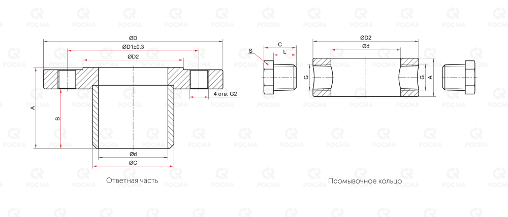 - На ответную часть ОЧ, через фторопластовую прокладку, устанавливается промывочное кольцо.