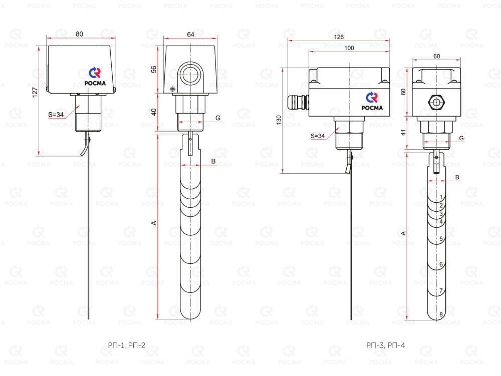 Тип РП. Предназначены для контроля наличия или отсутствия потока воды и других жидких сред, неагрессивных к медным сплавам (модель РП-1 и РП-3), неагрессивным к нержавеющей стали (модель РП-2 и РП-4). Реле могут быть использованы в отопительных, охлаждающих и водоочистных системах, а также в насосных станциях и на любых трубопроводах.