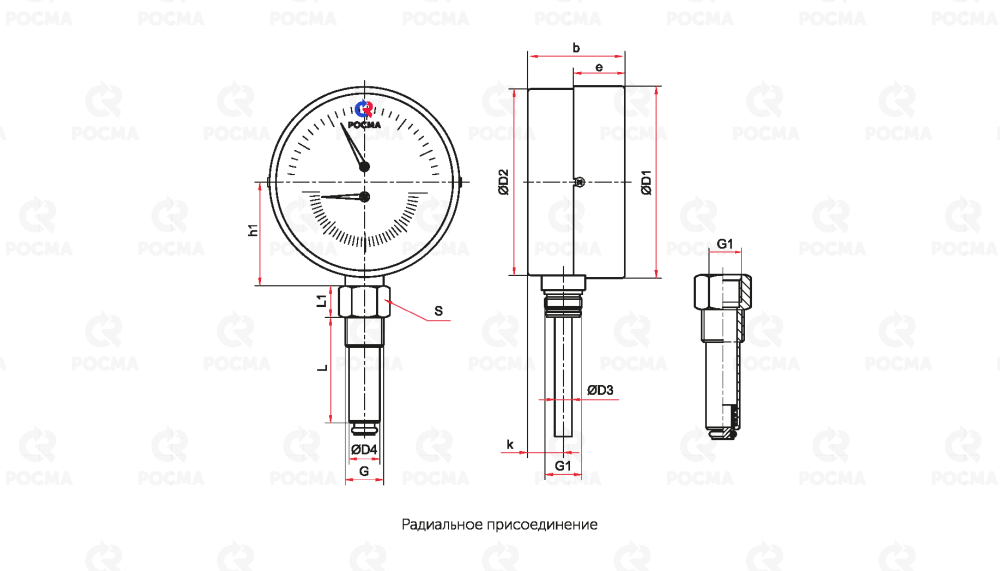 Термоманометр объединяет в одном корпусе манометр и термометр, имеет циферблат с двумя шкалами и две указательных стрелки. Одна шкала служит для отсчета давления, другая — температуры. Компания РОСМА выпускает устройства двух типоразмеров: диаметром корпуса 80 и 100 мм. По расположению штуцера приборы подразделяются на осевые и радиальные. Длина погружной части также может варьироваться по заказу потребителя.