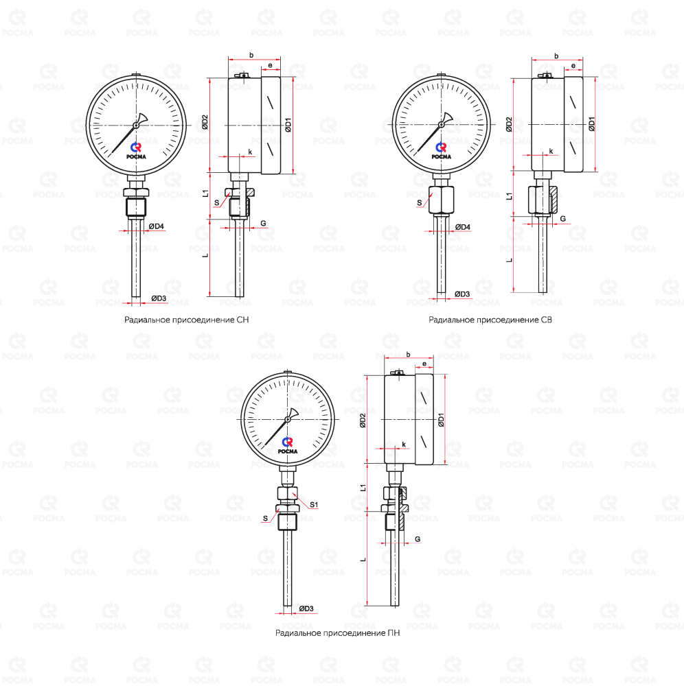 Термометры БТ, серия 220 с возможностью гидрозаполнения силиконом (радиальное присоединение с резьбами CH, CB, ПН)
