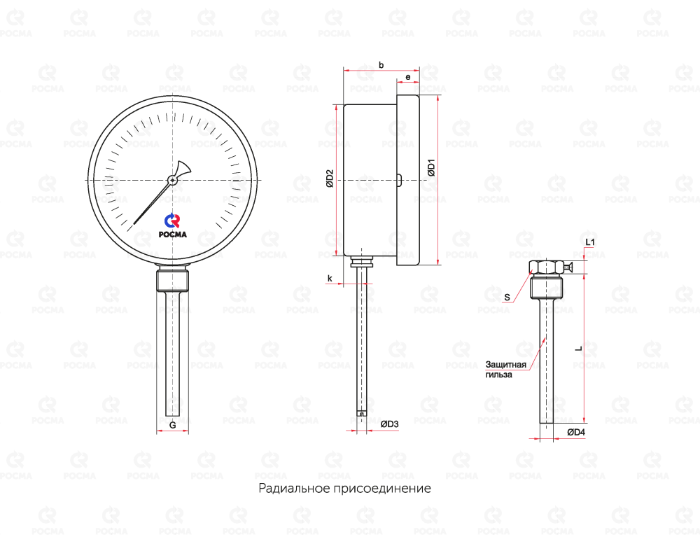 Тип БТ, серия 211. Радиальное присоединение в комплекте с защитной латунной гильзой. Термометр радиальный биметаллический предназначен для измерения температуры жидкостей, пара и газов в отопительных и санитарных установках, в системах кондиционирования и вентиляции. Принцип действия прибора основан на зависимости деформации чувствительного элемента от измеряемого значения, °C. В качестве чувствительного элемента используется биметаллическая пружина. Она изготавливается из двух прочно соединенных металлических пластин, имеющих различные температурные коэффициенты линейного расширения. При изменении температуры пружина изгибается и вращает стрелку термометра. Один конец пружины закреплен внутри штока, а к другому присоединяется ось стрелки. Корпус прибора изготавливается из коррозионностойкой стали, шток — из нержавеющей стали.
